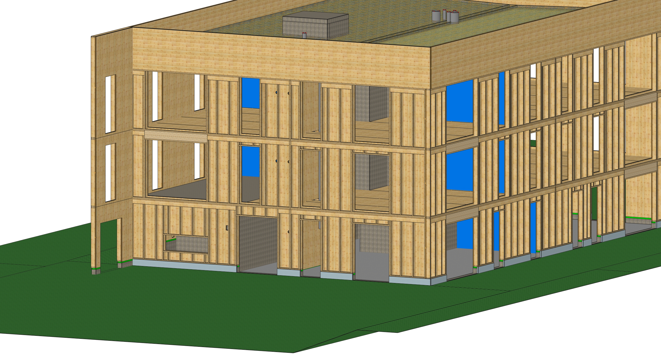 comprenant logements commerces et équipements publics avec façades et plancher en bois sur un béton de fondation bas-carbone. L’opération comprend trois bâtiment avec une structure en bois type CLT et 30 % des besoins d’eau chaude sanitaire seront assurés par 160 m2 de panneaux solaires.