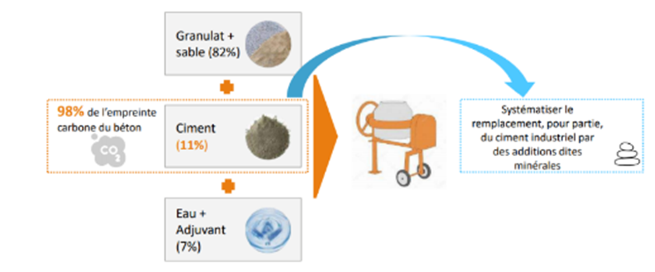 Les ciments représentent à eux seuls 98 % de l’empreinte carbone du béton. C’est au moment de la fabrication du ciment, et plus particulièrement du clinker son constituant principal, que les émissions de carbone sont les plus fortes, car le clinker est obtenu par cuisson d’un mélange de calcaire et d’argile à très haute température, processus physico-chimique très émissif en termes de CO2.
